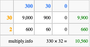 Below is an illustration showing you how to calculate 330 times 32 using the box method, using the instructions above.