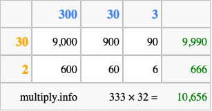That's all there is to it! As you can see from the box above, the answer to 333 times 32 using the box method is 10,656.