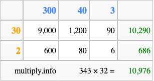 That's all there is to it! As you can see from the box above, the answer to 343 times 32 using the box method is 10,976.