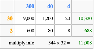 That's all there is to it! As you can see from the box above, the answer to 344 times 32 using the box method is 11,008.