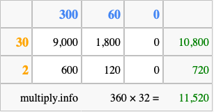 That's all there is to it! As you can see from the box above, the answer to 360 times 32 using the box method is 11,520.