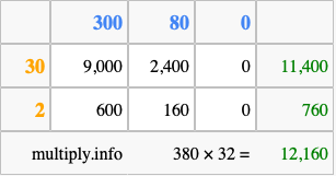 Finally, we add up all the sums we found in step 3 to get our final answer to 380 times 32.