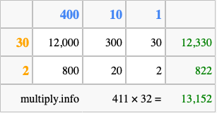 That's all there is to it! As you can see from the box above, the answer to 411 times 32 using the box method is 13,152.