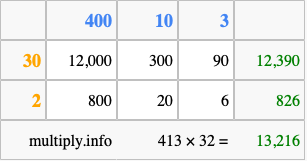That's all there is to it! As you can see from the box above, the answer to 413 times 32 using the box method is 13,216.