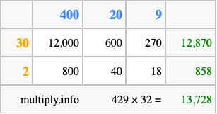 That's all there is to it! As you can see from the box above, the answer to 429 times 32 using the box method is 13,728.