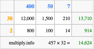 That's all there is to it! As you can see from the box above, the answer to 457 times 32 using the box method is 14,624.