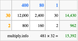 Finally, we add up all the sums we found in step 3 to get our final answer to 481 times 32.