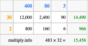 That's all there is to it! As you can see from the box above, the answer to 483 times 32 using the box method is 15,456.