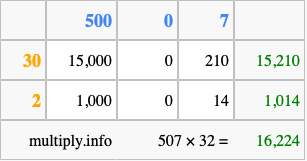 That's all there is to it! As you can see from the box above, the answer to 507 times 32 using the box method is 16,224.