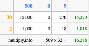 That's all there is to it! As you can see from the box above, the answer to 509 times 32 using the box method is 16,288.