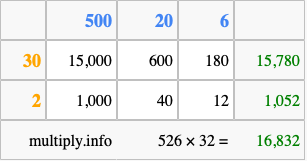 Below is an illustration showing you how to calculate 526 times 32 using the box method, using the instructions above.