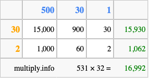 That's all there is to it! As you can see from the box above, the answer to 531 times 32 using the box method is 16,992.