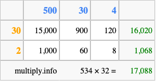 That's all there is to it! As you can see from the box above, the answer to 534 times 32 using the box method is 17,088.