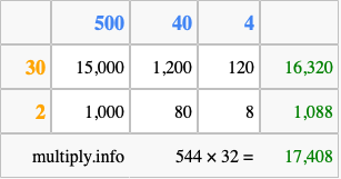 That's all there is to it! As you can see from the box above, the answer to 544 times 32 using the box method is 17,408.