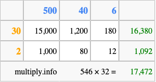 That's all there is to it! As you can see from the box above, the answer to 546 times 32 using the box method is 17,472.