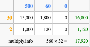 That's all there is to it! As you can see from the box above, the answer to 560 times 32 using the box method is 17,920.