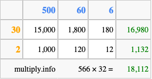 That's all there is to it! As you can see from the box above, the answer to 566 times 32 using the box method is 18,112.