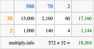 That's all there is to it! As you can see from the box above, the answer to 572 times 32 using the box method is 18,304.