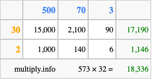 That's all there is to it! As you can see from the box above, the answer to 573 times 32 using the box method is 18,336.