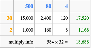 That's all there is to it! As you can see from the box above, the answer to 584 times 32 using the box method is 18,688.