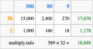 That's all there is to it! As you can see from the box above, the answer to 589 times 32 using the box method is 18,848.