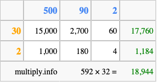 That's all there is to it! As you can see from the box above, the answer to 592 times 32 using the box method is 18,944.