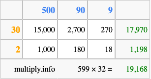 Below is an illustration showing you how to calculate 599 times 32 using the box method, using the instructions above.