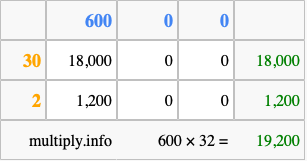 That's all there is to it! As you can see from the box above, the answer to 600 times 32 using the box method is 19,200.