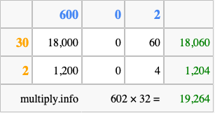 That's all there is to it! As you can see from the box above, the answer to 602 times 32 using the box method is 19,264.