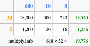 That's all there is to it! As you can see from the box above, the answer to 618 times 32 using the box method is 19,776.