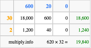 Below is an illustration showing you how to calculate 620 times 32 using the box method, using the instructions above.
