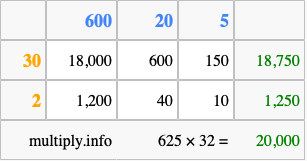 That's all there is to it! As you can see from the box above, the answer to 625 times 32 using the box method is 20,000.