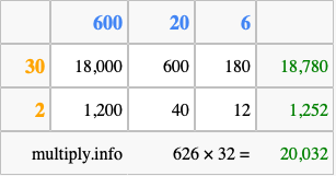 Below is an illustration showing you how to calculate 626 times 32 using the box method, using the instructions above.