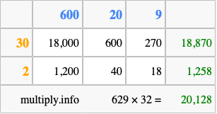 That's all there is to it! As you can see from the box above, the answer to 629 times 32 using the box method is 20,128.