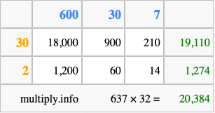 Below is an illustration showing you how to calculate 637 times 32 using the box method, using the instructions above.