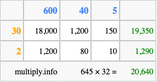 That's all there is to it! As you can see from the box above, the answer to 645 times 32 using the box method is 20,640.