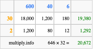 That's all there is to it! As you can see from the box above, the answer to 646 times 32 using the box method is 20,672.