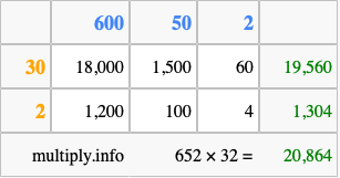 That's all there is to it! As you can see from the box above, the answer to 652 times 32 using the box method is 20,864.