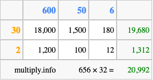 That's all there is to it! As you can see from the box above, the answer to 656 times 32 using the box method is 20,992.
