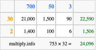Finally, we add up all the sums we found in step 3 to get our final answer to 753 times 32.