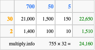 Finally, we add up all the sums we found in step 3 to get our final answer to 755 times 32.