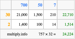 Below is an illustration showing you how to calculate 757 times 32 using the box method, using the instructions above.
