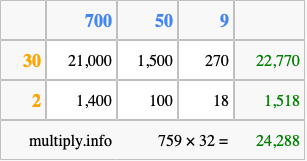 Below is an illustration showing you how to calculate 759 times 32 using the box method, using the instructions above.