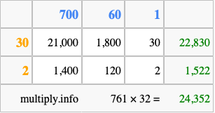 Below is an illustration showing you how to calculate 761 times 32 using the box method, using the instructions above.