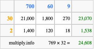 That's all there is to it! As you can see from the box above, the answer to 769 times 32 using the box method is 24,608.