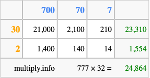 That's all there is to it! As you can see from the box above, the answer to 777 times 32 using the box method is 24,864.