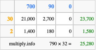 That's all there is to it! As you can see from the box above, the answer to 790 times 32 using the box method is 25,280.