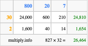 Below is an illustration showing you how to calculate 827 times 32 using the box method, using the instructions above.
