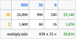 Below is an illustration showing you how to calculate 838 times 32 using the box method, using the instructions above.