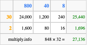 Finally, we add up all the sums we found in step 3 to get our final answer to 848 times 32.